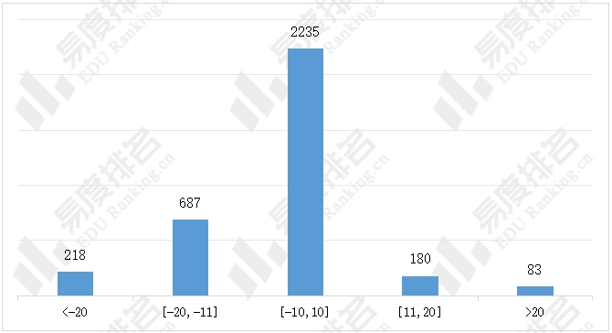 下图展示了湖南2025年物理类普通本科批院校-专业组投档最低分与上一年度同位分差值的直方图,差值为负代表院校-专业组2025年的投档位次有所下降,反之则代表院校-专业组的投档位次有所上升。