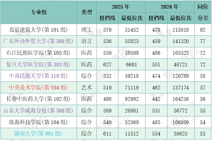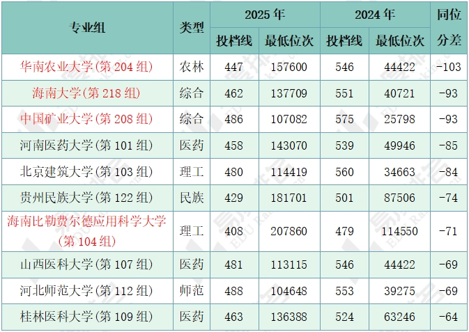 注:1.2024年同位分=2024年投档位次在2025年一分一段表中所对应的分数;2.仅含两年均招生的专业组