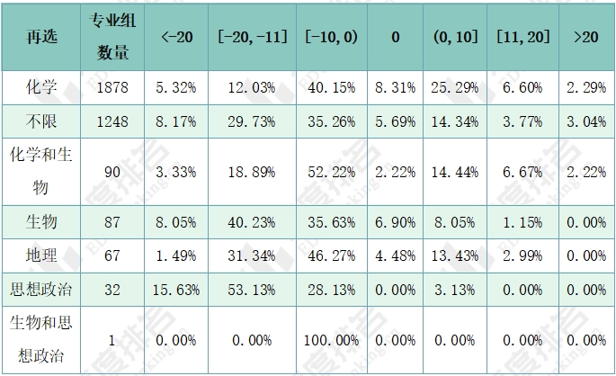 下表展示了湖南院校-专业组各选科的同位分差分布情况。各专业组再选科目以