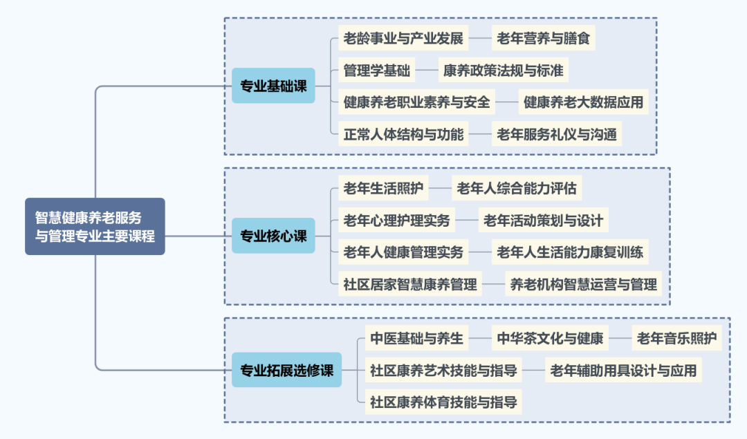 本专业注重培养学生“智能养老技术应用能力(智能终端运维/养老大数据分析)+康养服务管理能力(适老化改造/银发产品营销)”,通过整合物联网、大数据、人工智能技术(如智能健康监测设备、养老机器人应用)与养老服务、老年心理学、运营管理等核心模块,实现“智慧+养老+管理”的跨领域融合。