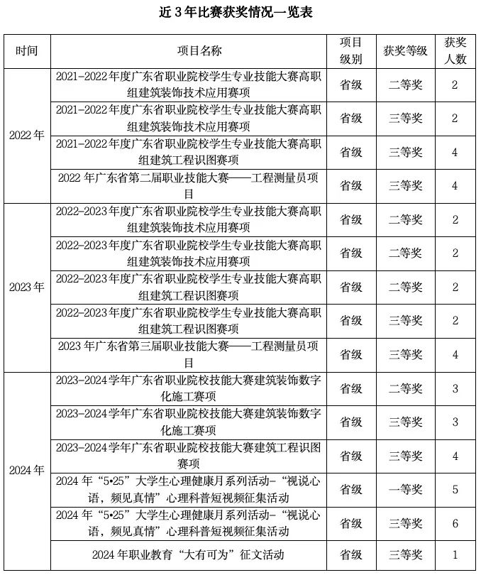 2019至2023年度指导学生参加广东省职业院校学生专业技能大赛建筑工程识图赛项比赛均获得三等奖,2023年获得二等奖。
