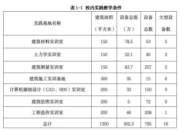 目前本专业校内实训基地总建筑面积1350平方米;设备总值302.3万元;总设备数795(台/套),其中大型设备数16(台/套)。生均实训面积1.92平方米。校内实践教学条件如表1-1列表及图片所示。