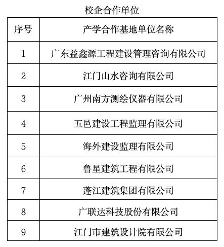 本专业已与广东益鑫源工程建设管理咨询有限公司、江门山水咨询有限公司、广州南方测绘仪器有限公司、五邑建设工程监理有限公司、海外建设监理有限公司、鲁星建筑工程有限公司、蓬江建筑集团有限公司、广联达科技股份有限公司等多家知名企业建立了深度的校企合作关系。