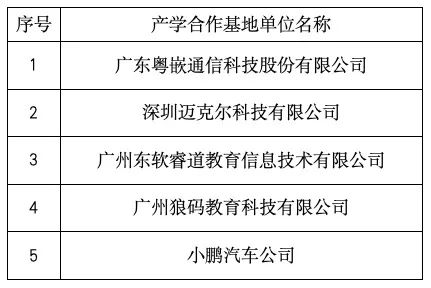 我校人工智能技术应用专业确立高质量技能人才培养的教育观,突出“能力”训练,强化技能培训和职业技能的拓展训练,先后与广东粤嵌通信科技股份有限公司、深圳麦克尔科技有限公司、广州东软睿道教育信息技术有限公司、广州狼码教育科技有限公司、小鹏汽车公司等企业建立校企合作实训基地,学校与企业共同开发课程,共同培养学生。见下表。