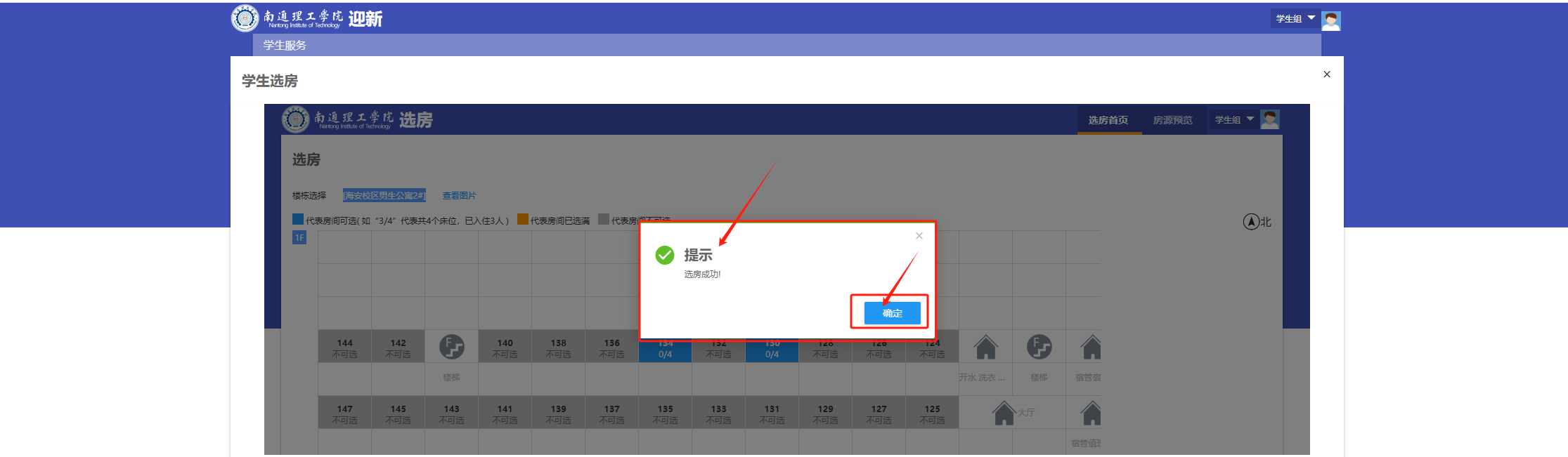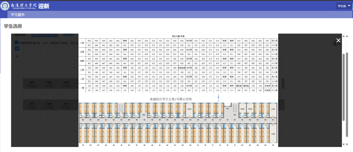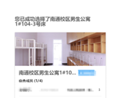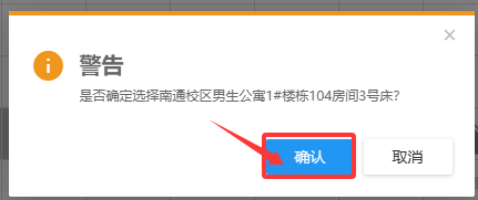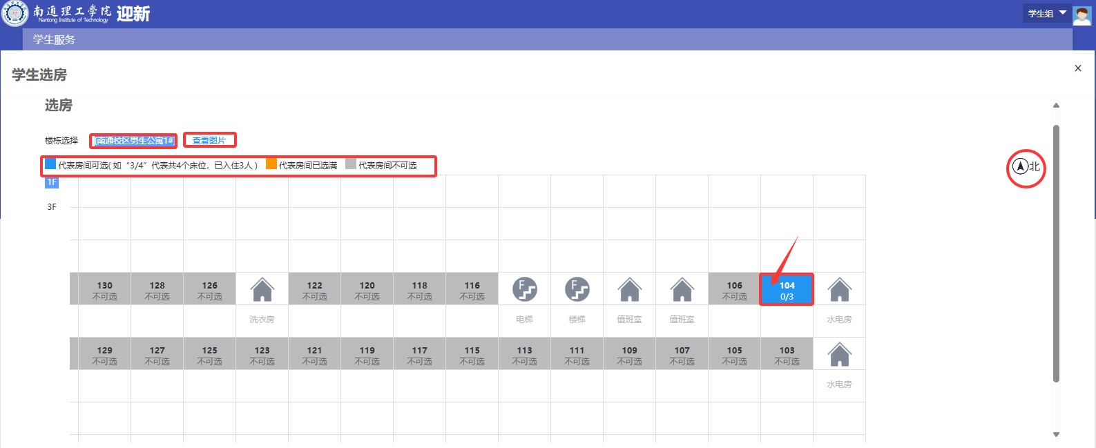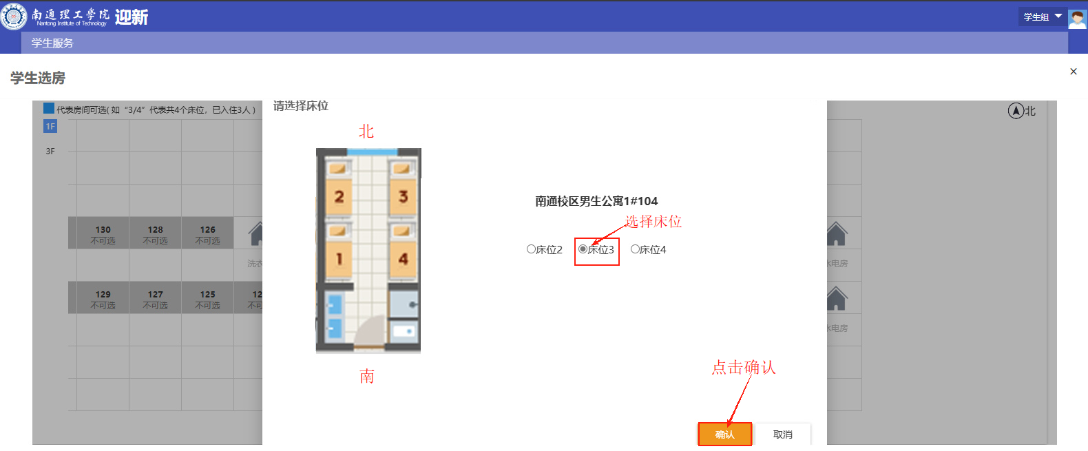 点击“点击进入”按钮,进入选房页面;系统显示可选择的宿舍为学校按照学院、专业、省份划分的宿舍范围,点击“查看图片”根据参考示意图选择对应房间及床位,以“南通校区男生公寓1#-104室-3号床为例”点击“104”房间后选择“床位3”并确认,在弹出页面进行二次确认即床位锁定。锁定时长为1小时,完成缴费后,选房成功。若未在规定时间内(1小时)完成缴费,则床位释放。