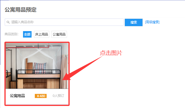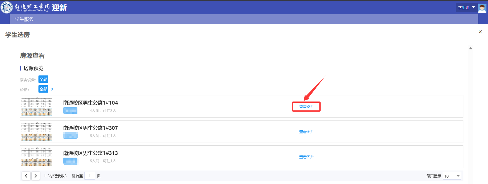在房源预览框中,点击“点击进入”可查看可选宿舍收费标准、房间类型、房间可选床位数,点击“查看图片”可查看宿舍图片;