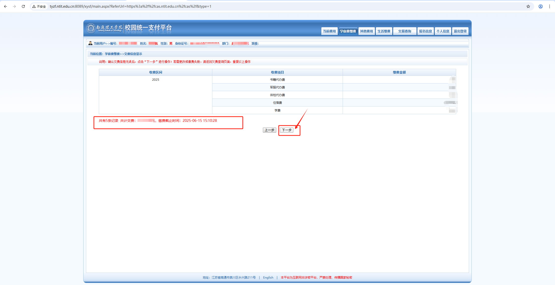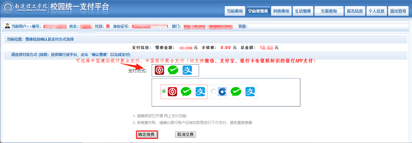 点击“财务缴费”,进入南通理工学院“校园统一支付平台”;点击“下一步”,选择并确认自己需要缴费的项目;确认缴费信息无误后,可选择中国建设银行聚合支付、中国银行聚合支付(均支持微信、支付宝、银行卡有银联标识的银行APP支付),点击“确认支付”,扫码完成缴费。
