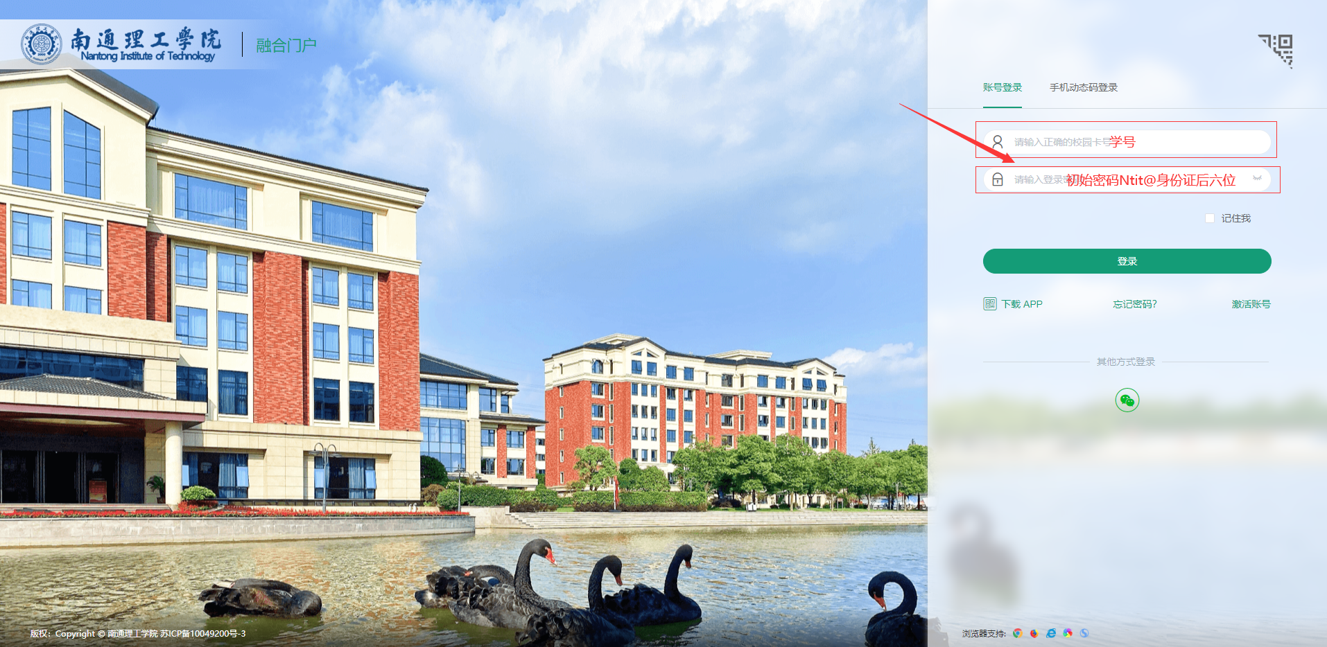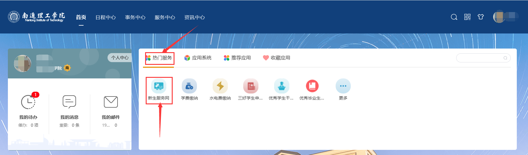 输入学号(学号印刷在录取通知书上),初始密码为Ntit@身份证号后6位,进入校园融合门户,点击“热门服务”-“新生自助报到服务网”即可进入新生服务网首页。