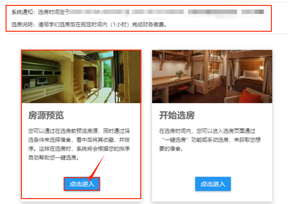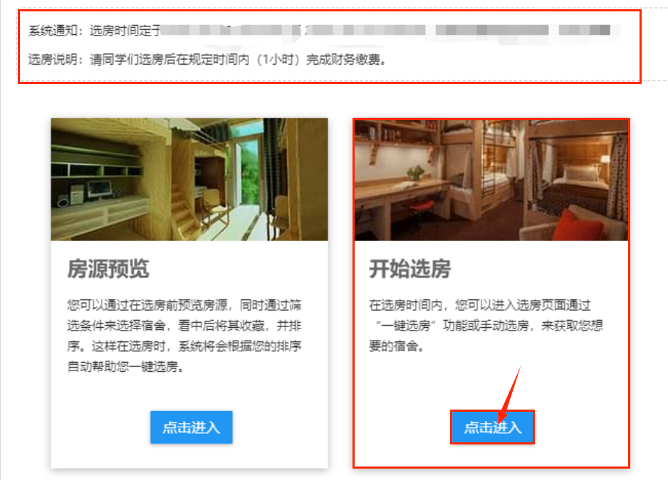 点击“学生选房”,进入选房页面(注意上方系统通知及选房说明内容),可预选择览房源或直接开始选房;