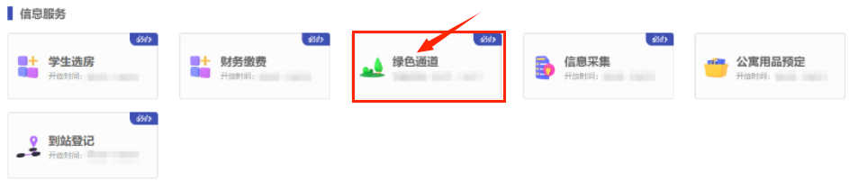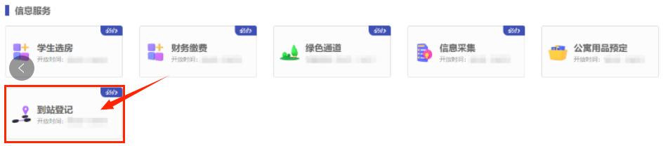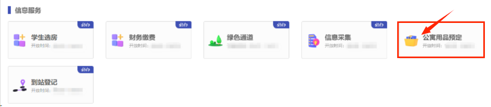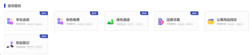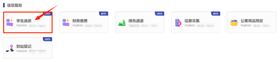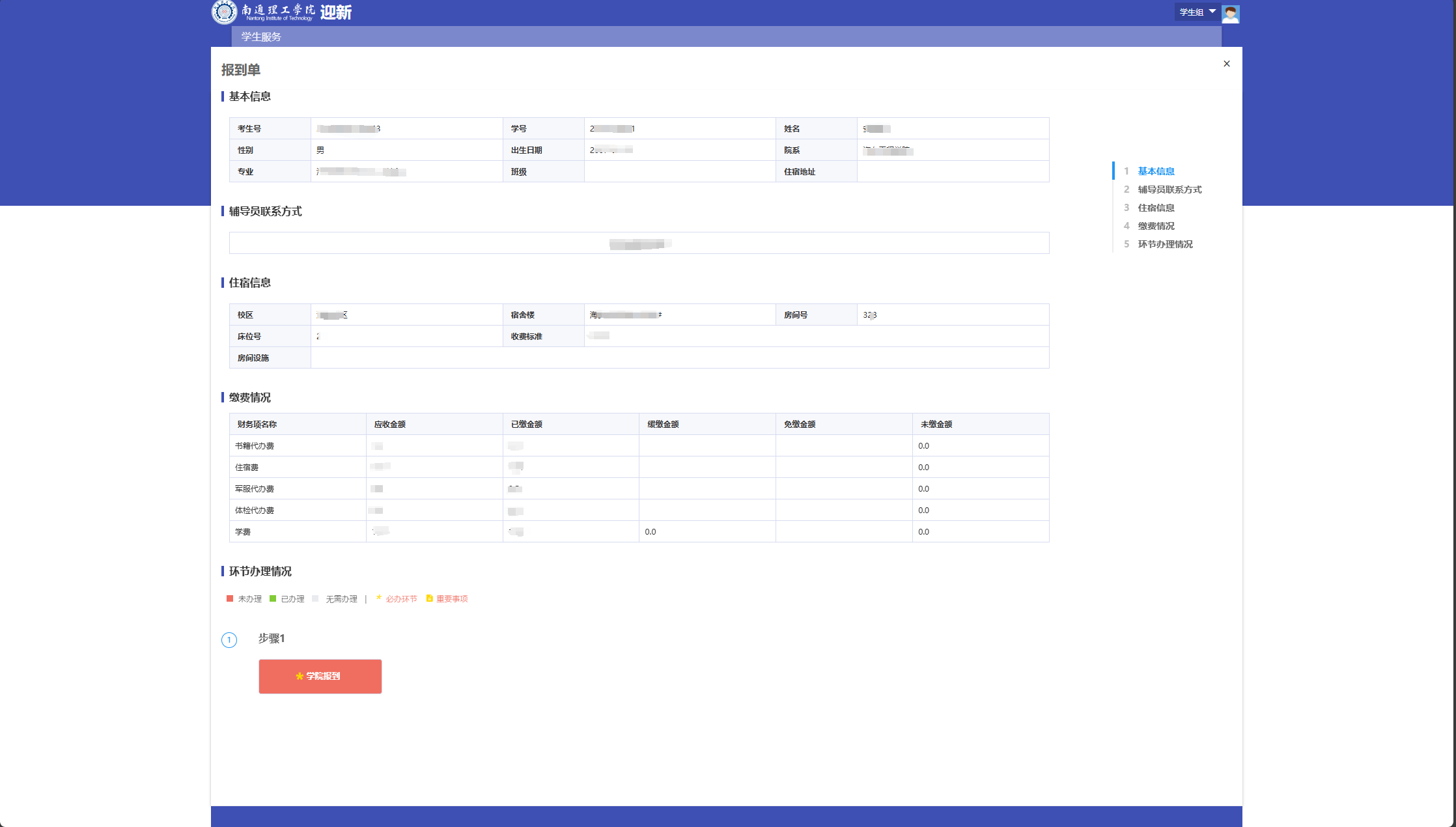 学生须按顺序依次完成各环节办理:“学生选房”→“财务缴费”→“绿色通道”(仅限于因特殊情况无法缴清全部费用的学生办理)→“信息采集”→“公寓用品预定”→“到站登记”。