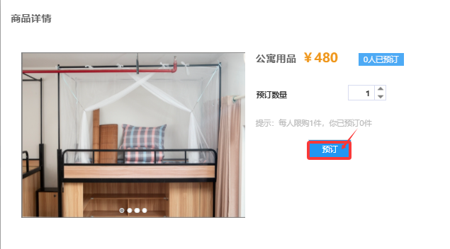 点击“公寓用品预定”(该环节为非必办环节),进入商品详情页面,学生根据需求选择是否购买公寓用品。若选择“预定”,本环节只做登记,无需线上缴费,待报到当天,到校内指定地点缴费并领取用品。