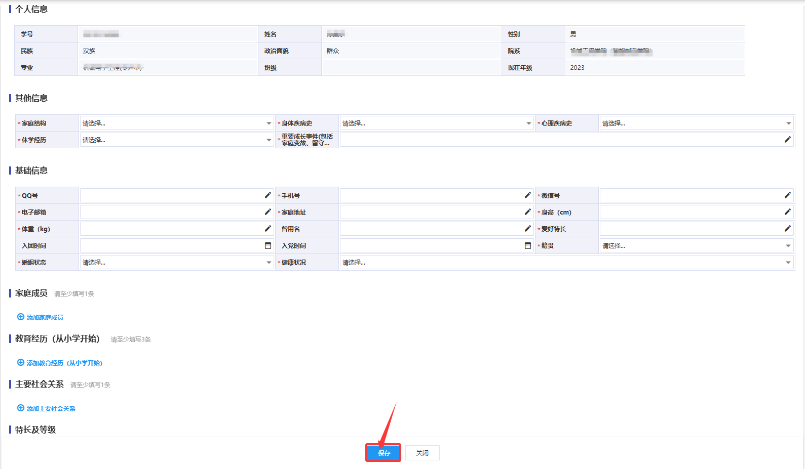 点击“个人信息”进入填写个人基本信息,其中家庭成员至少填写1条,家庭教育经历至少填写3条、主要社会关系至少填写1条。本部分数据用于生成 “学生入学信息登记表”,该表将放入学生档案袋,请务必认真填写并核对无误后点击保存。