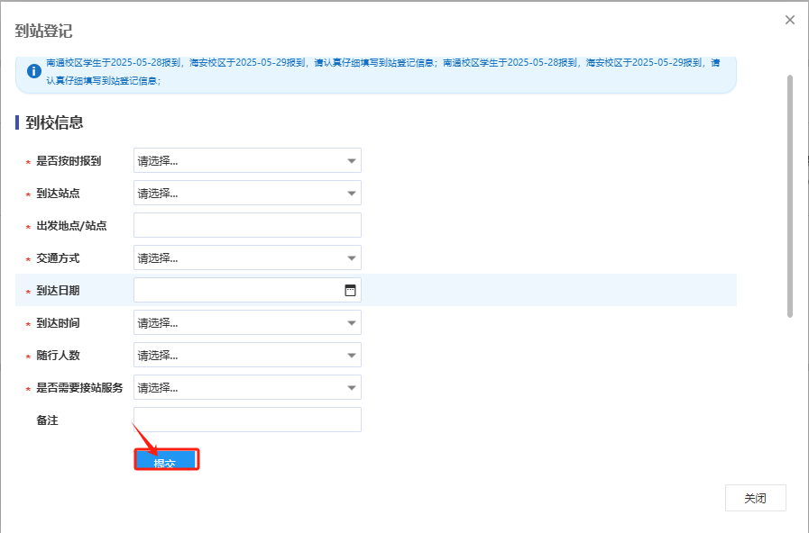 点击“到站登记”,按实填写是否按时报到、到达站点、出发地点/站点等信息。点击“提交”按钮即完成到站登记。
