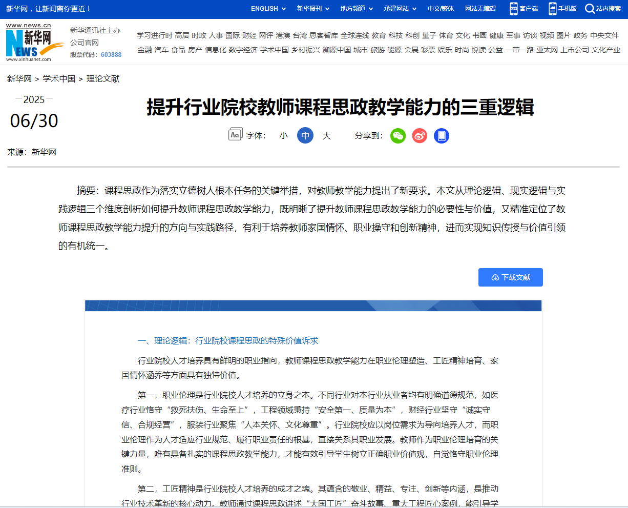 近日,《新华网》刊发我校理论文章《提升行业院校教师课程思政教学能力的三重逻辑》。文章指出,课程思政作为落实立德树人根本任务的关键举措,对教师教学能力提出了新要求。文章从理论逻辑、现实逻辑与实践逻辑三个维度剖析如何提升教师课程思政教学能力,既明晰了提升教师课程思政教学能力的必要性与价值,又精准定位了教师课程思政教学能力提升的方向与实践路径,有利于培养教师家国情怀、职业操守和创新精神,进而实现知识传授与价值引领的有机统一。