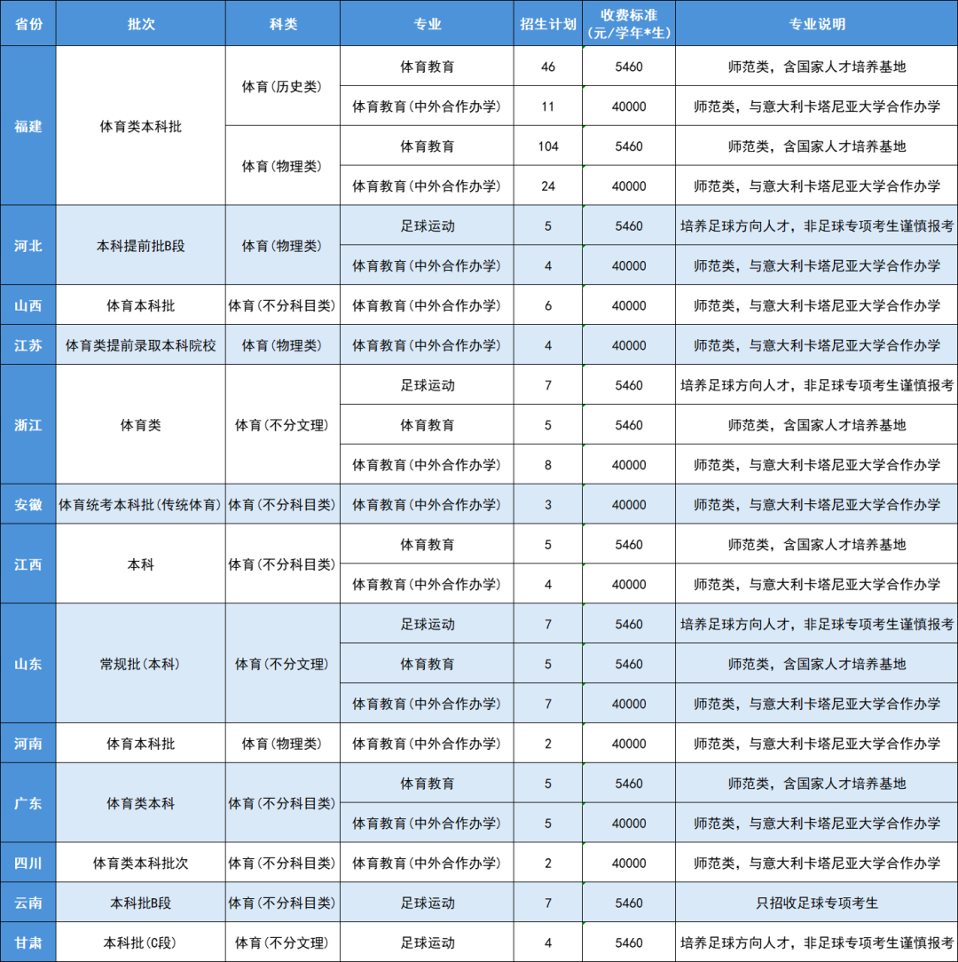 福建师范大学2025年体育类招生计划汇总