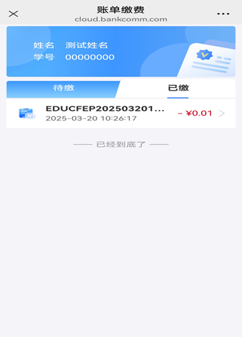 3.使用银校通缴费成功后,如在缴费记录中已查到缴费成功记录(如下图),即可证明缴费成功,大家可不必再向财务处或招办进行到账确认,如有问题,学院会主动联系您。(温馨提示:由于学费金额较大,建议使用一类银行卡账户办理支付)
