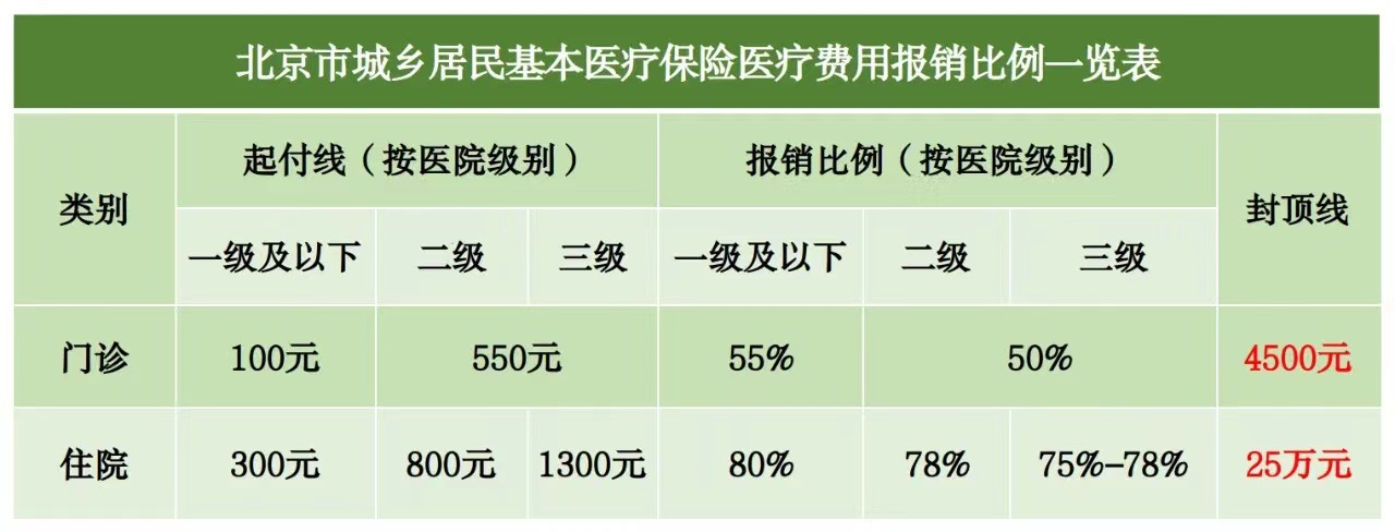 5、新生入学需携带一张本人名下的商业银行储蓄卡(例如:邮储银行、招商银行、农业银行、建设银行、北京银行、北京农商银行等),用于缴纳北京市城乡居民“一老一小”医保费用。此项医疗保险属于国家基础医疗范围,自愿缴纳(2025年医保费用为:405元/年,报销比例如下图),不能与全国其它地区基础医疗同时享受待遇。