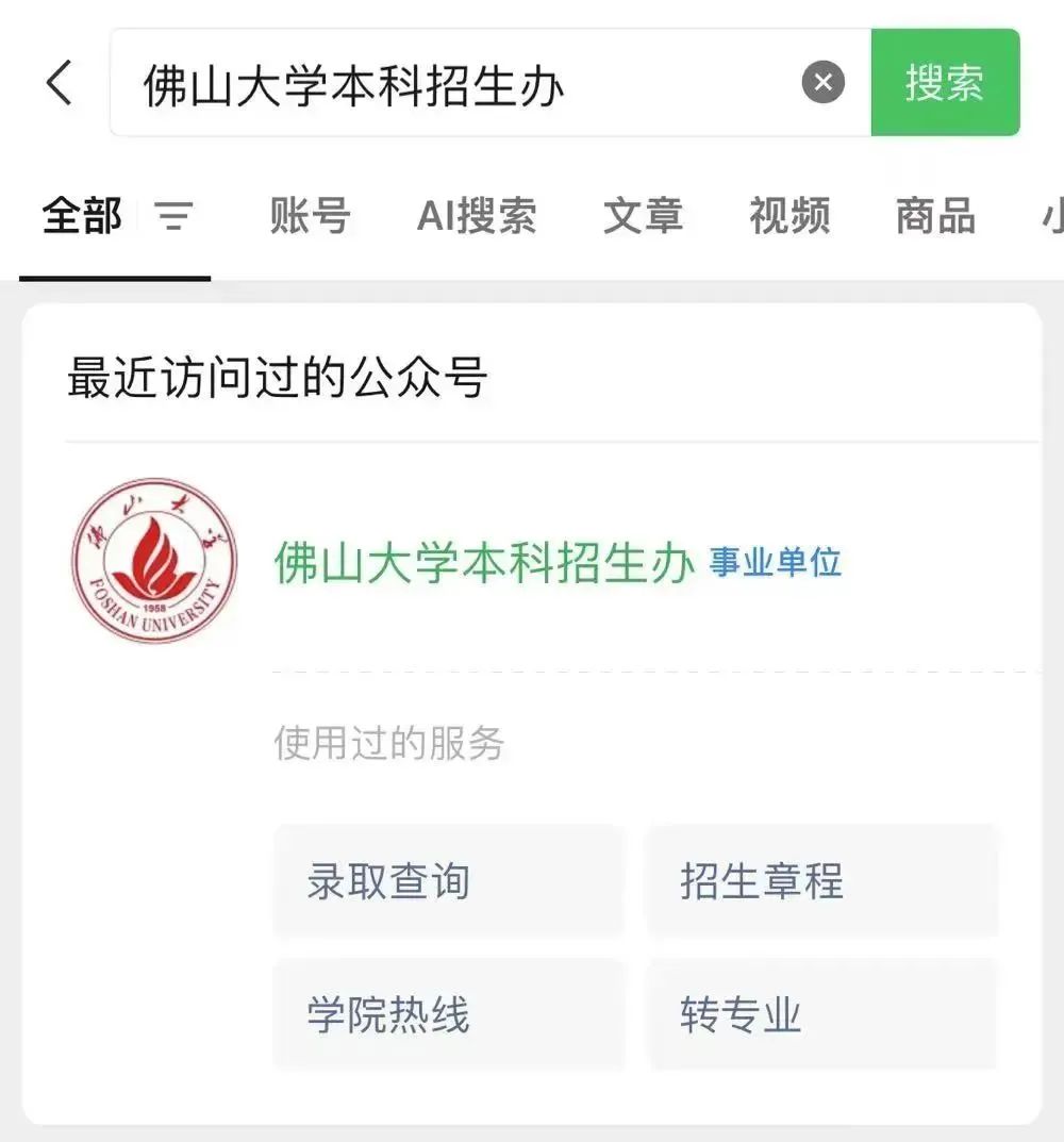 途径1:官方微信公众号在手机微信搜索:佛山大学本科招生办,进入公众号