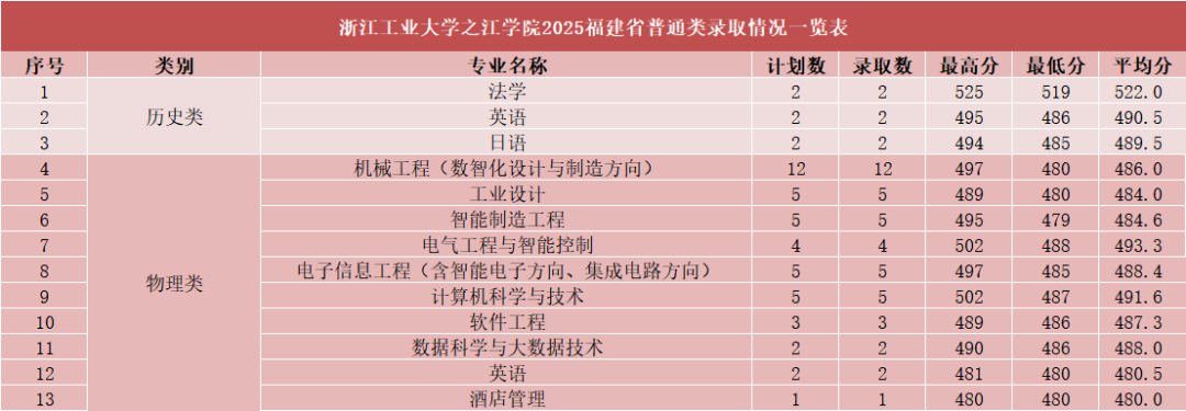 我院顺利完成2025年福建省普通类录取工作,计划招生50个,实际录取50个。其中,历史类计划招生6个,实际录取6个,最高分525分,最低分485分;物理类计划招生44个,实际录取44个,最高分502分,最低分479分。