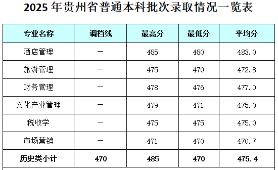 贵州省普通本科批次实行平行志愿投档模式,历史类调档线为470分,物理类1组(不限选考)调档线416分,物理类2组(选考生物)调档线420分。(详见“2025年贵州省普通本科批次录取情况一览表”)