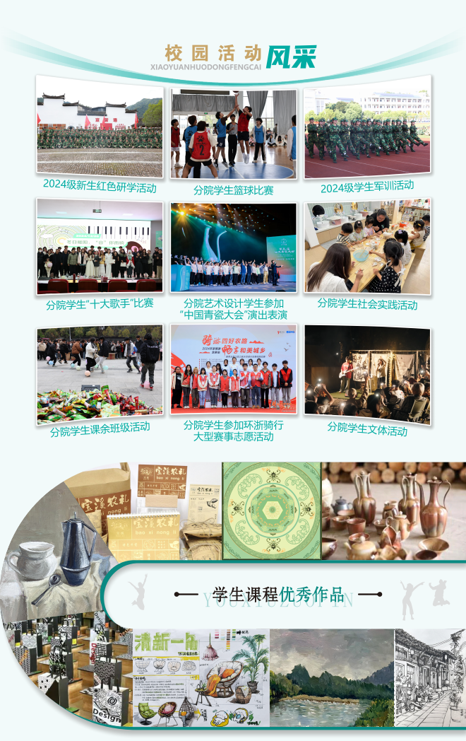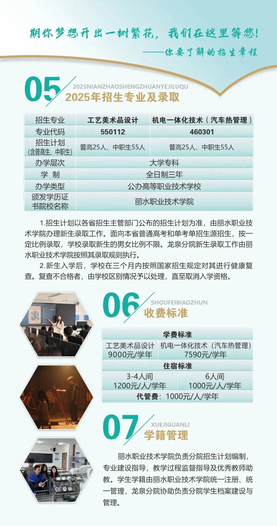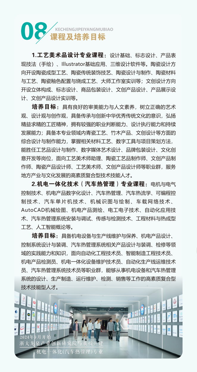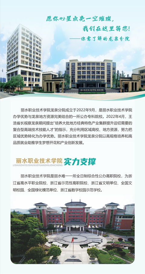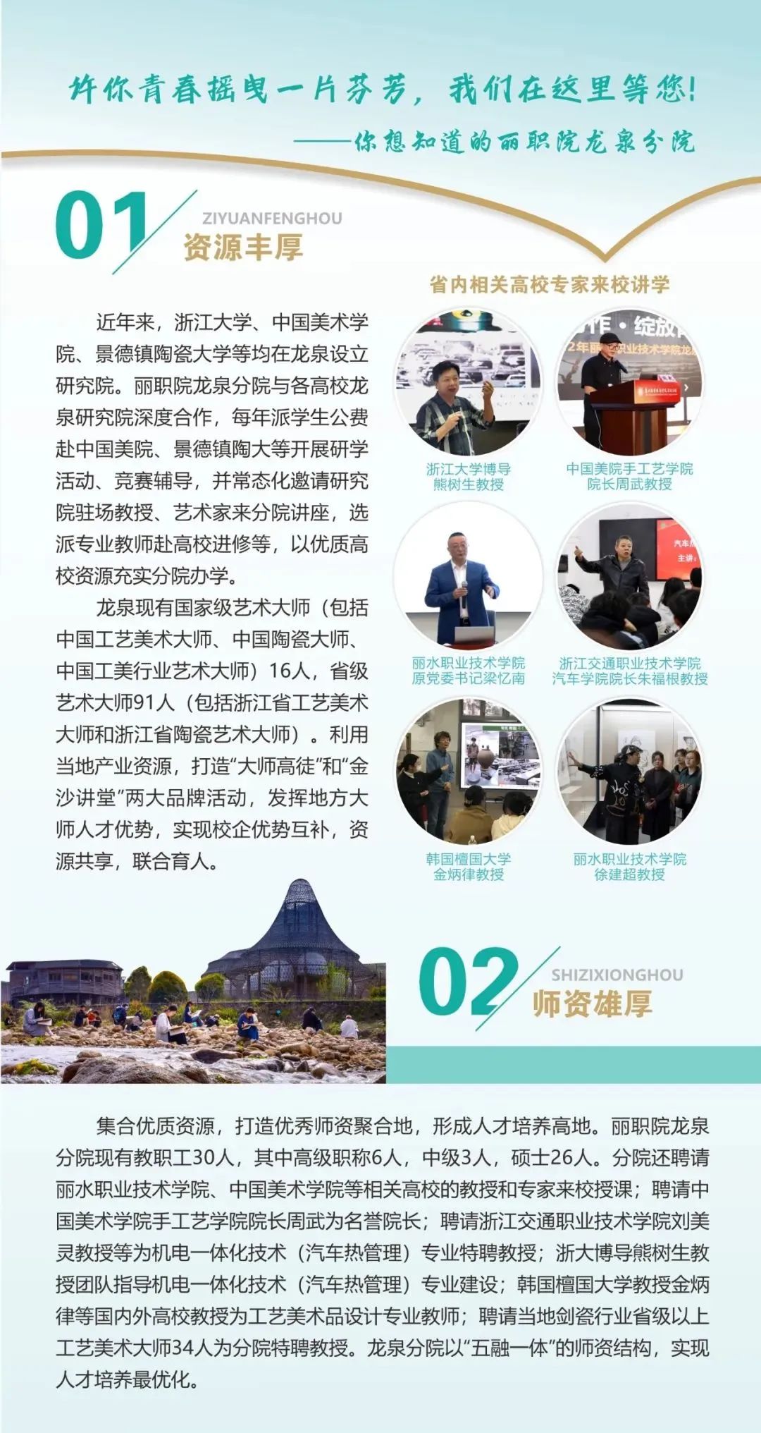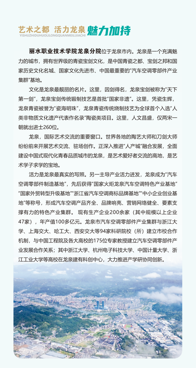 依据王浩书记(2022年4月龙泉调研)指示精神“培养大批地方各经典特色产业集群提升迫切需要的复合型高端技术技能人才”,丽水职业技术学院龙泉分院在省市各级领导的大力支持下,积极探索富有地方特色的高职教育办学工作,目前分院开设工艺美术品设计专业和机电一体化(汽车热管理)专业,着力为地方特色产业集群培养急需的高技能人才。分院秉持扎根产业办专业,把地方产业集群优势资源转化为办学有力资源,聚合高校资源和企业资源,强化内涵建设、修炼内功,成功开创了在浙江山区26县优势产业集群地区创办大学的先例,办学成效显著。丽水职业技术学院龙泉分院真诚欢迎您的到来,一起享受“剑瓷之都”传统与现代艺术交融的熏陶,开创您美好人生的新乐章。