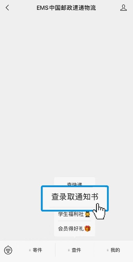 录取通知书寄出1个工作日后,考生可关注“EMS中国邮政速递物流”服务号,点击“查件”→“查录取通知书”→“邮件查询”→录入考生号(14位高考报名号)查询录取通知书物流信息。