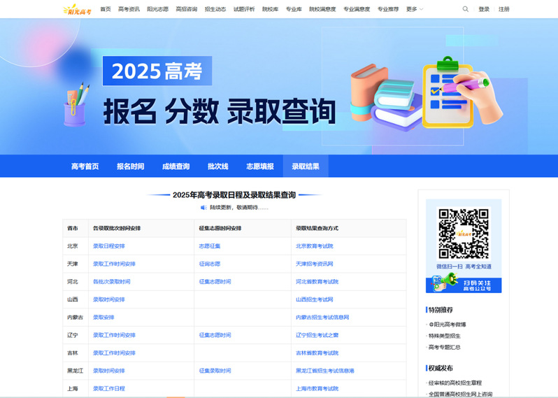 通过教育部“阳光高考”平台查询2025年高考录取日程及录取结果。