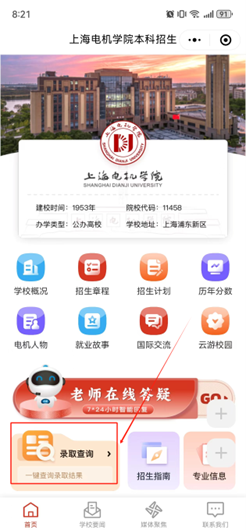 通过微信 “上海电机学院本科招生” 小程序中的“录取查询”,一键查询录取结果。