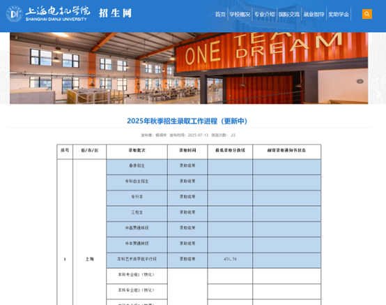 2025年上海电机学院秋季招生录取工作进程可在学校招生网“2025年秋季招生录取工作进程(更新中)”实时查询。