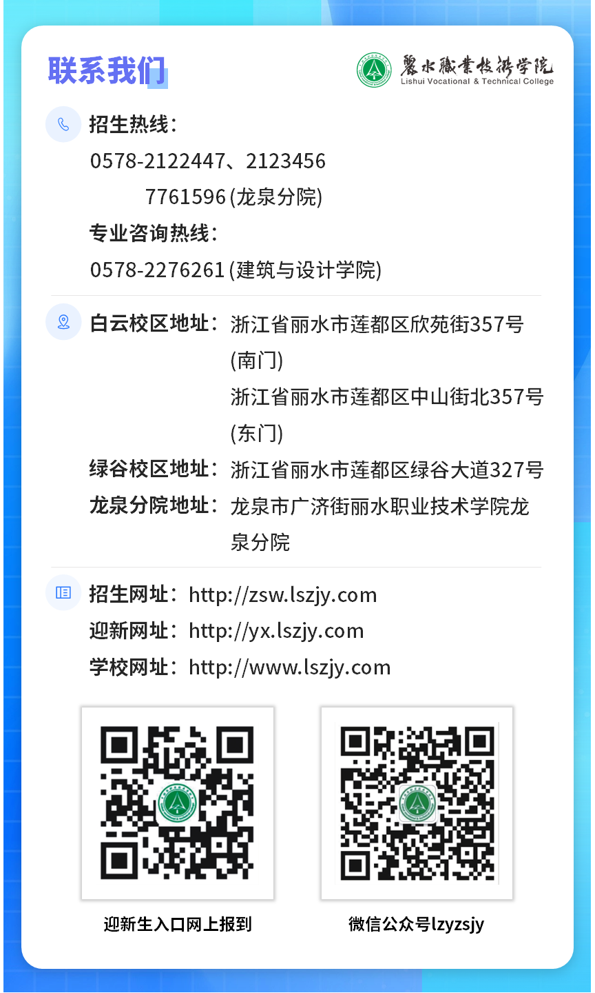 学院为浙江省职业院校产教融合项目实习实训基地,为浙江省建设类从业人员计算机网络考试丽水考点,拥有全省唯一设在高校的测绘技能鉴定培训点。学院有测绘地理信息技术、智能建造技术、工程造价、建筑室内设计、艺术设计5个专业,其中测绘地理信息技术系浙江省“十三五”特色专业。