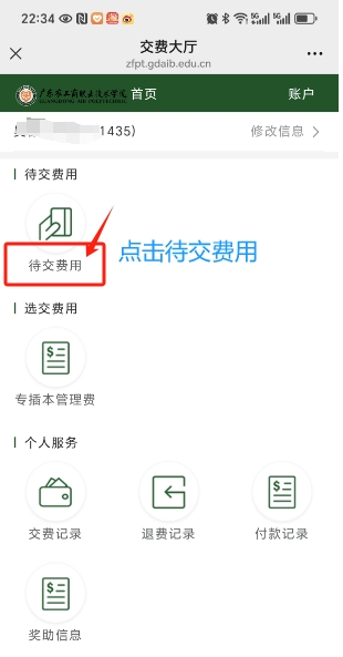 第五步:进入待交费用界面,点击“待交费用”图标,选择“自主招生考试报名费”,如下图: