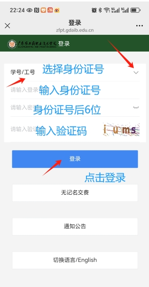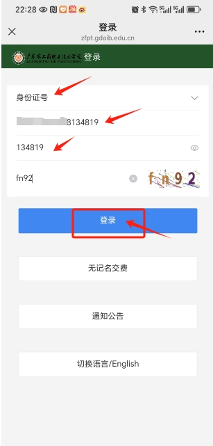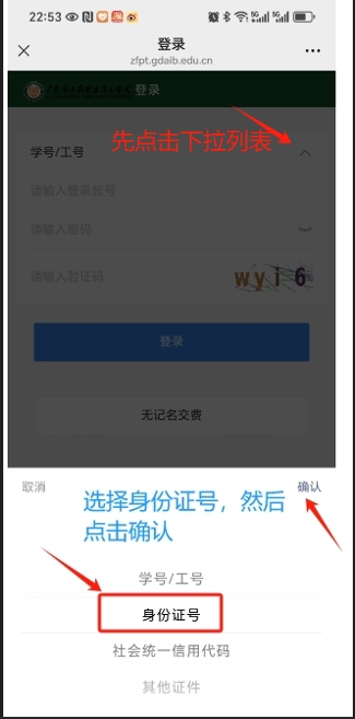 第三步:在“缴费大厅”界面,先点击下拉列表文本框选择“身份证号”;第二个文本框录入“考生本人身份证号码”;第三个文本框输入密码(考生身份证号后6位,如果含X则是大写字母);第四个文本框,录入对应的验证码,然后点击登录,如下图: