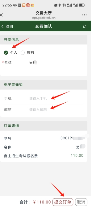 第七步:输入手机号或电子邮箱,“提交订单”,如下图: