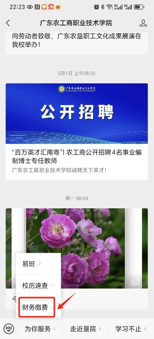第二步:在当前公众号界面点击“为你服务”—点击“财务缴费”,如下图: