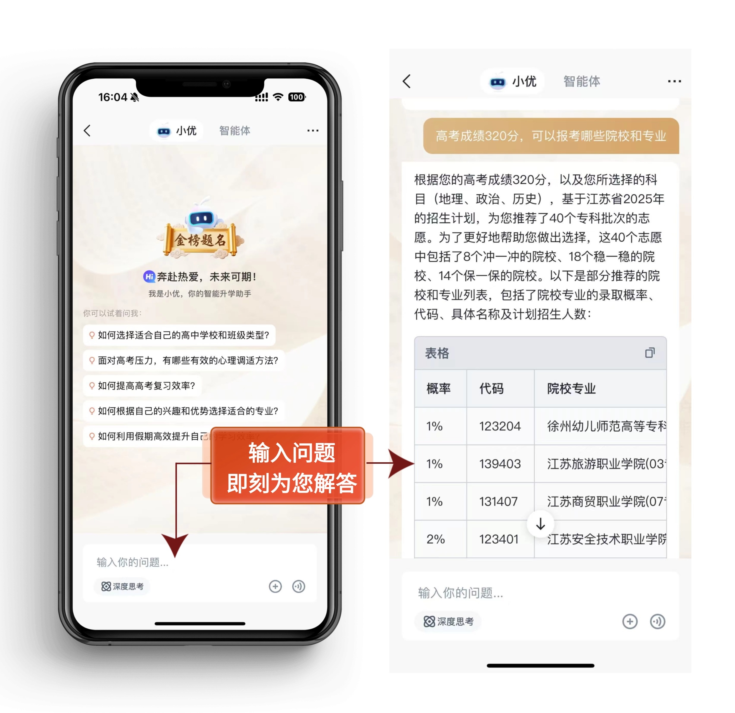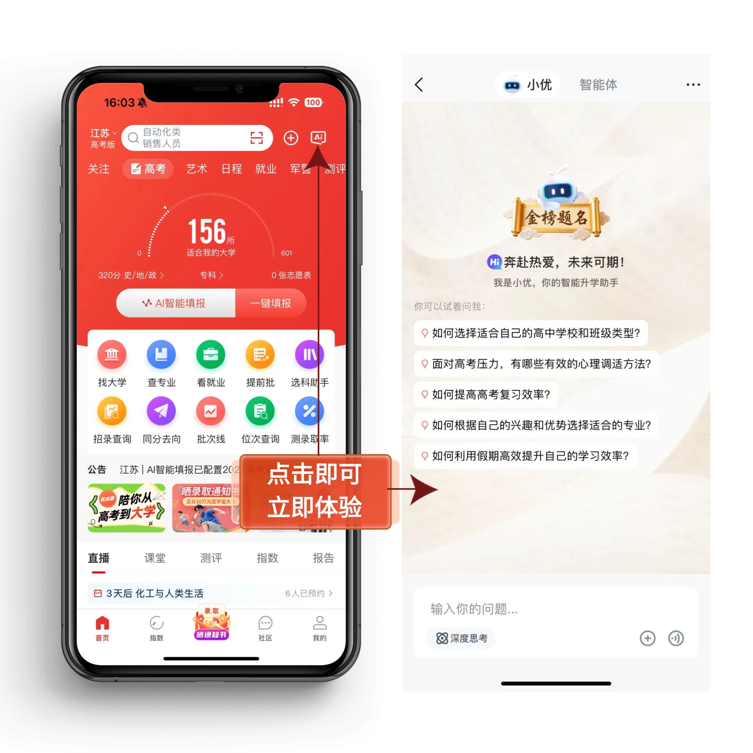 优志愿的"小优升学AI" 作为一款集成全网信息搜索与智能规划功能的升学助手,正以"查、测、填、学、问"一体化服务,为千万家庭构建起精准高效的升学信息网。其核心优势体现在四大维度: