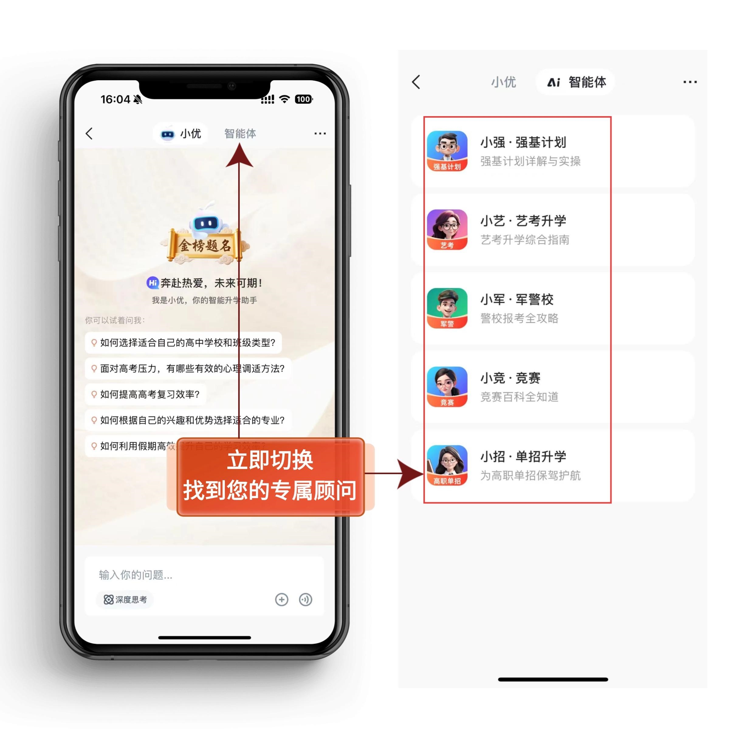 针对强基计划、艺考、军警校等个性化需求,平台推出"小强""小艺""小军"等专属智能体。以"小竞"(竞赛升学顾问)为例,它不仅能解析各学科竞赛的含金量、备考策略,还能关联竞赛获奖与名校特招的关联规则,为竞赛生提供从选赛到升学的全流程指导。这些细分智能体如同各领域的"升学老手",让特殊路径的规划更专业、更高效。
