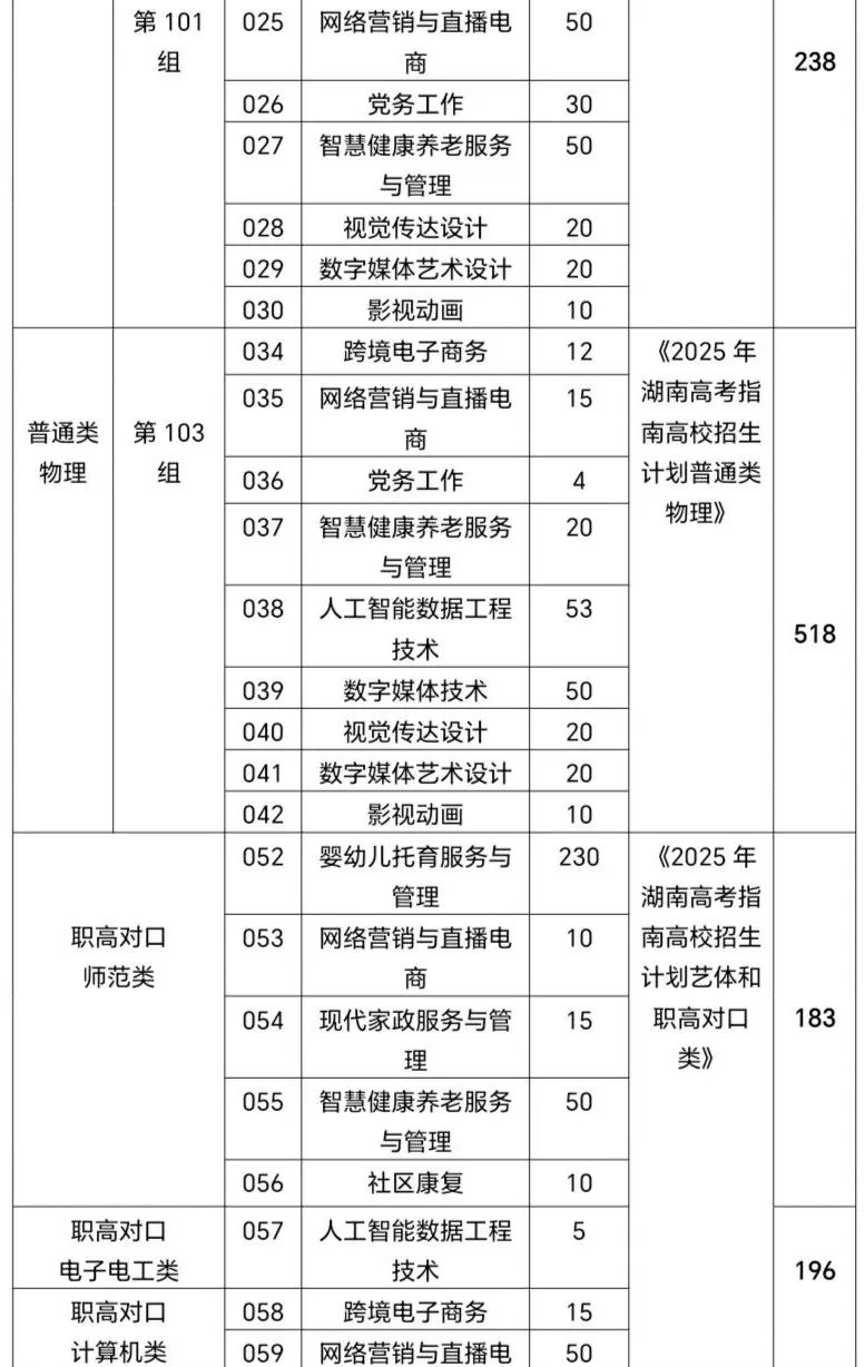 (二)《2025年湖南高考指南高校招生计划》分为三册:普通类历史、普通类物理、艺体和职高对口类。在高校招生计划分册中查高职专科批,查页码,找院校代码4770,详情见下表: