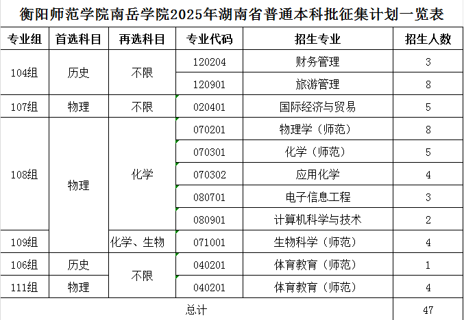 衡阳师范学院南岳学院2025年普通类征集志愿专业一览表