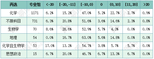 下表展示了福建院校-专业组各选科的同位分差分布情况,所有选科要求中同位分下降的专业组占比为73.4%,主要集中在下降10分以内,其占比为49.4%。