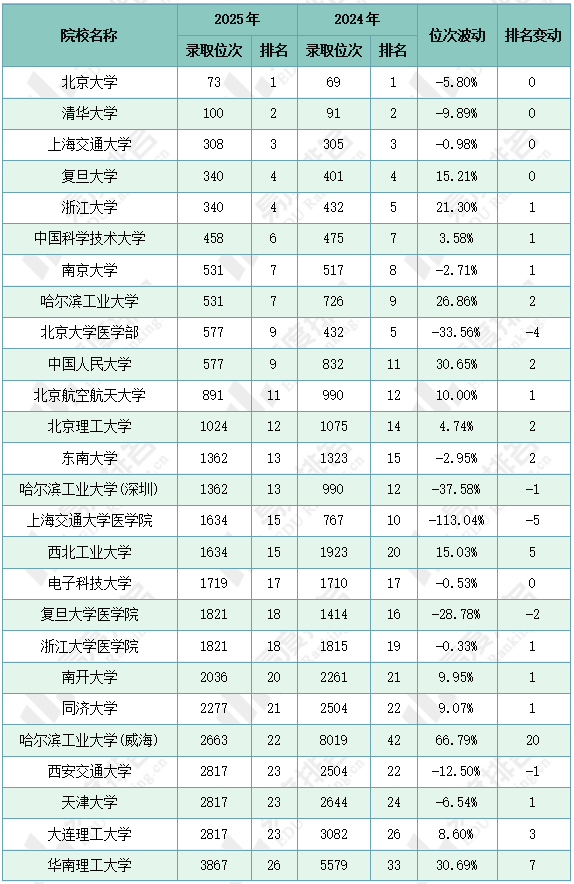 注:1.不含农村专项计划数据;2.仅统计2024-2025年均招生的专业组;3.专业组以2025年为准,2024年的投档线及位次为该专业组下各招生专业的最小值。