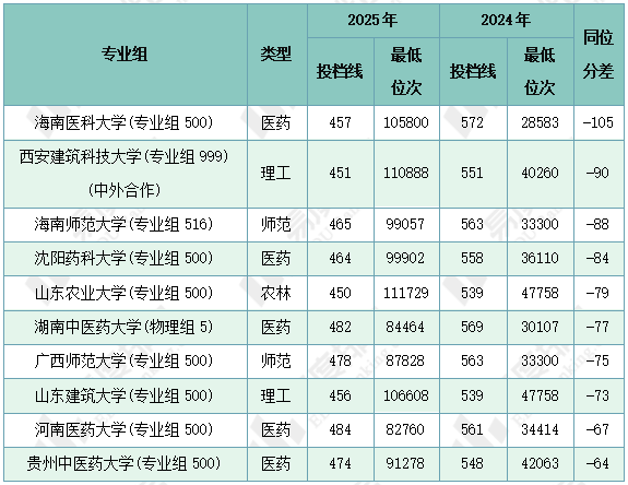 注:1.不含农村专项计划数据;2.仅含两年均招生的专业组数据;3.2024年同位分=2024年投档位次在2025年一分一段表中所对应的分数