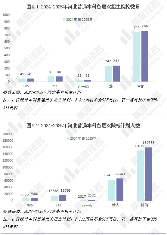 近两年在河北招生的重点及以上层次院校数量基本稳定,各层次的招生计划人数均有所增加,整体报考难度有所下降。