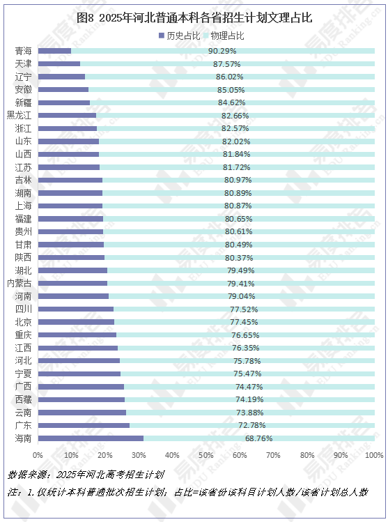 今年有17个省份在河北招收物理科目考生的占比超过80%,其中青海占比最高,达到90.29%。招物理考生占比最低的是海南地区,但其占比仍接近七成。
