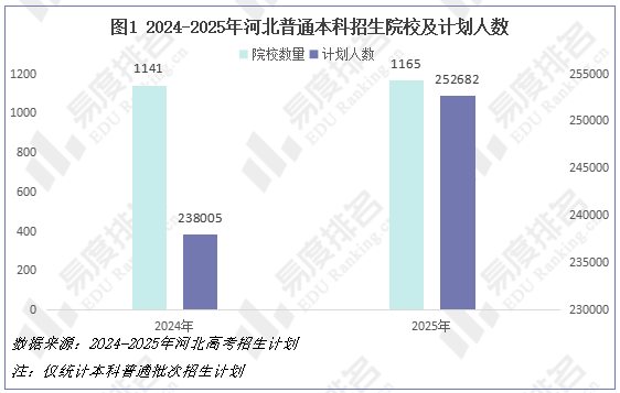 2025年高考在河北本科普通批招生的高校达到1165所,较去年增加24所。计划招生人数达到25.3万人,较去年增长6.2%。