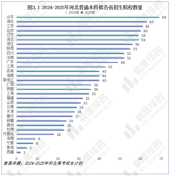 今年山东的招生院校数最多,达到69所,河北本省的院校为59所,在各省中排名第5位。今年河北省内高校计划招生人数达到15.7万人,省内院校计划人数占比达到62%。全国各省的招生计划相比去年均增长。