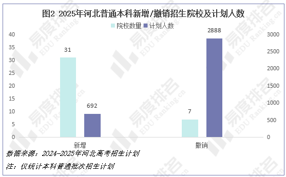 相比去年,今年新增31所高校在河北招生,新增院校的招生计划人数达到692人。撤销招生计划的院校有7所,这7所高校去年的招生计划2888人。