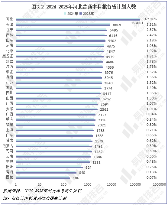 2025年高考在河北本科普通批计划招生25.3万人,较去年增加6.2%。今年河北省内高校计划招生15.7万人,较去年增加6千余人,省内高校招生名额占全国总计划的比例超62%。