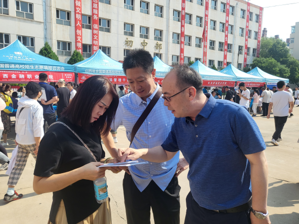 7月18日上午,学院党委书记杨敦勤、副院长廉红珍一行赴大同市第四中学招生咨询会工作现场,看望慰问一线工作人员,对招生宣传工作进行了指导并现场为高考考生及家长答疑解惑。杨敦勤书记亲切地与考生和家长面对面交流,介绍学院的基本概况,就考生和家长关心的专业分类、就业去向等问题进行耐心细致地解答。杨书记指出,招生工作是学院的“生命线”, 关系学院事业的兴衰,要切实增强招生工作的责任感和紧迫感。提高服务意识,抓好精准宣传,做好咨询服务,落实好招生方案的组织实施。