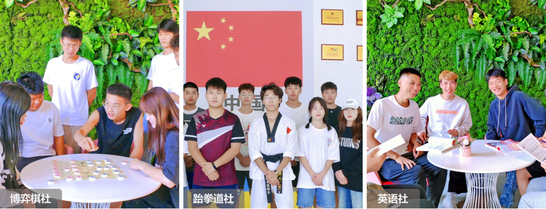 博弈棋社/书香学社/英语社/演讲与辩论社/桌游社/急救社/蓝天心理社/青年志愿者协会/电影社/书画社/滑板社/摄影社/动漫社/舞极限社/轮滑社/裁判协会/网球社/跆拳道社/武术社/健身健美协会/足球社/篮球社/排球社/羽毛球社/院长助理团/跆拳道示范团