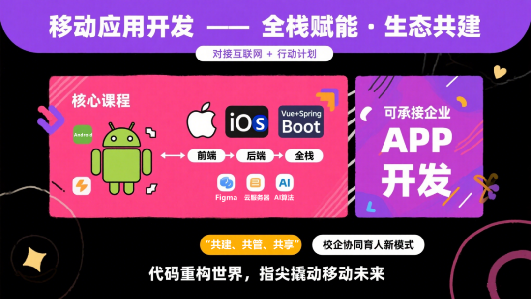 该专业聚焦Android/iOS应用开发、微信小程序、跨平台框架,培养具备职业综合素质和行动能力,面向互联网和相关服务、软件和信息技术服务等行业的计算机程序设计员、计算机软件工程技术人员等职业,能够从事移动端App开发、移动端Web开发、小程序开发、移动端应用测试等工作的高技能人才。